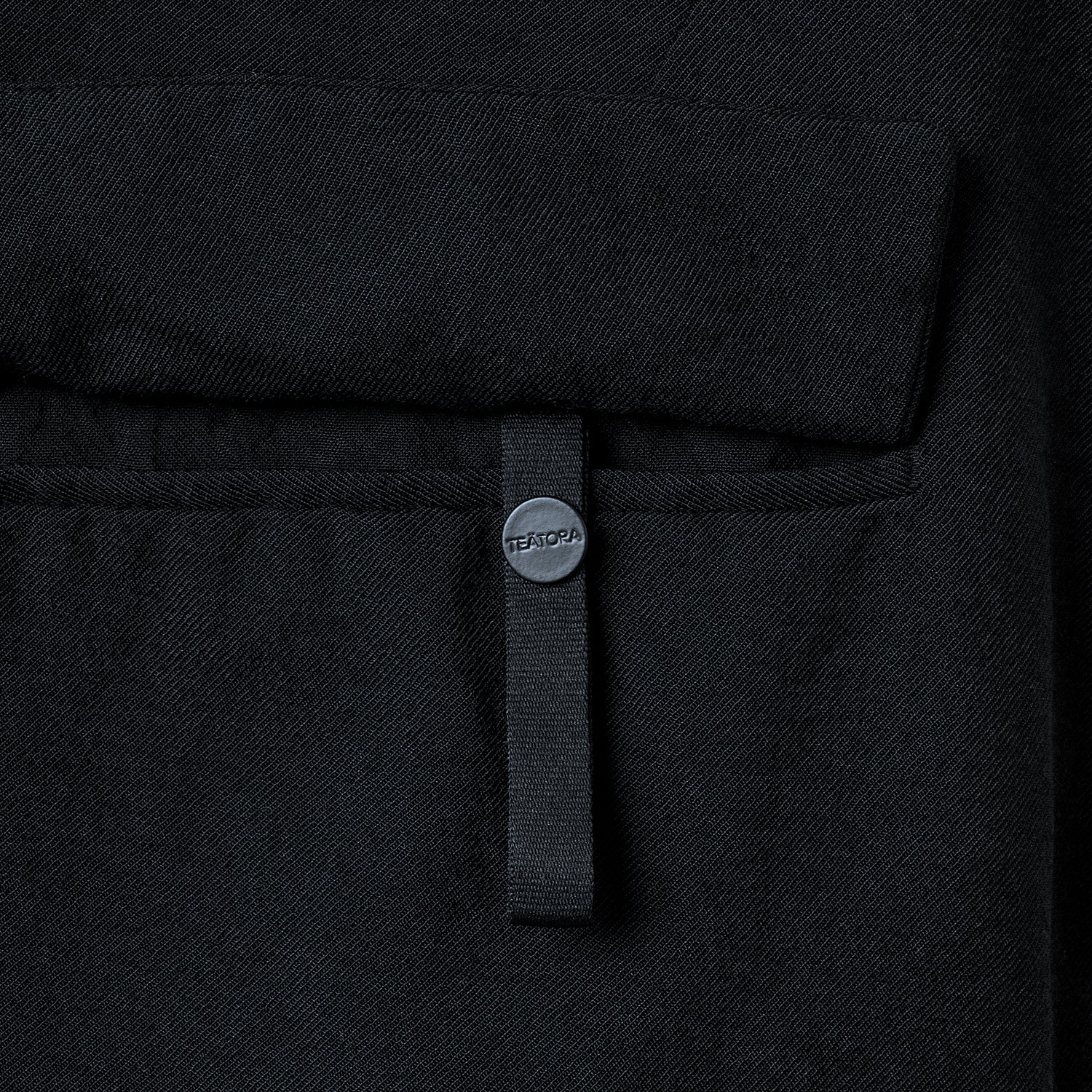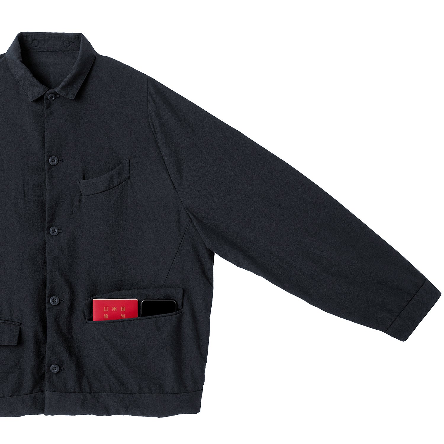 また、ON,OFFを選ばないその佇まいでありながら座面まで届かない着丈設計によってデスクワークはもちろん自転車、車などの座ったままの移動手段にも干渉しません。