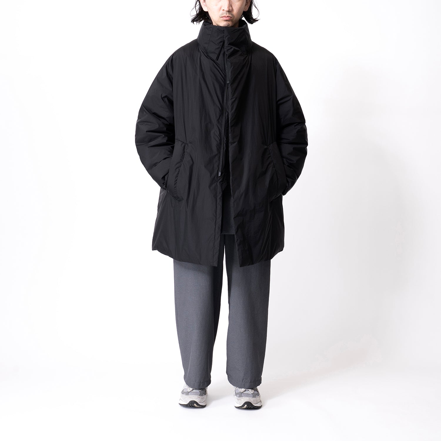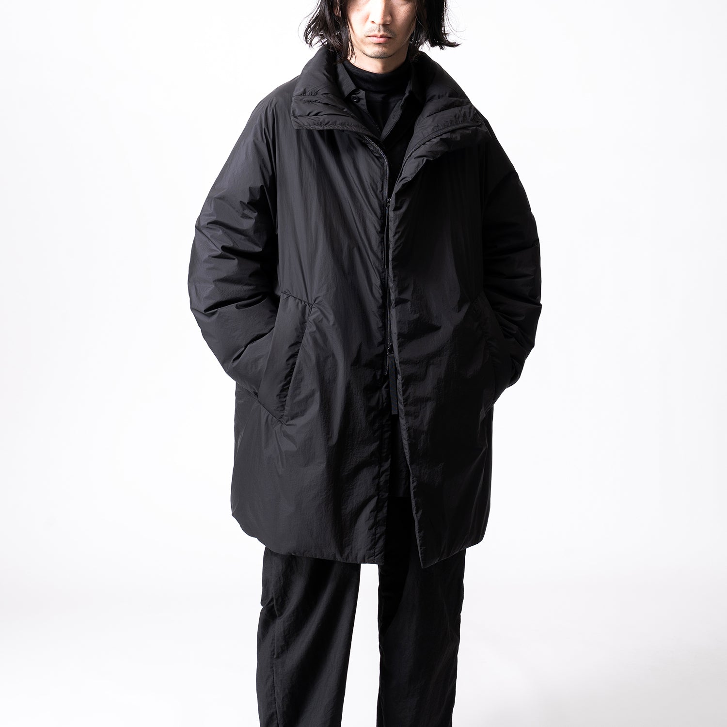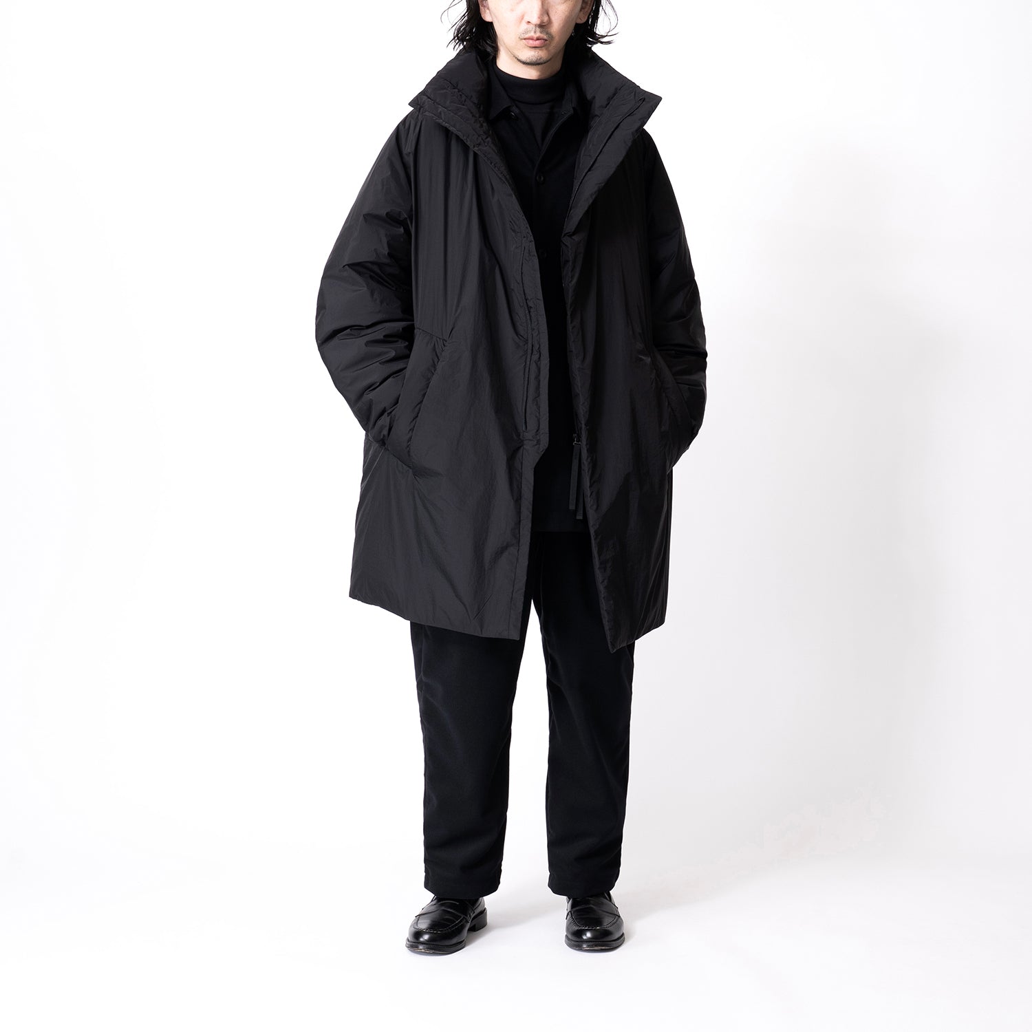 ゆったりとした身幅、綺麗な縦ラインを強調したシルエットが特徴のミドルコート。