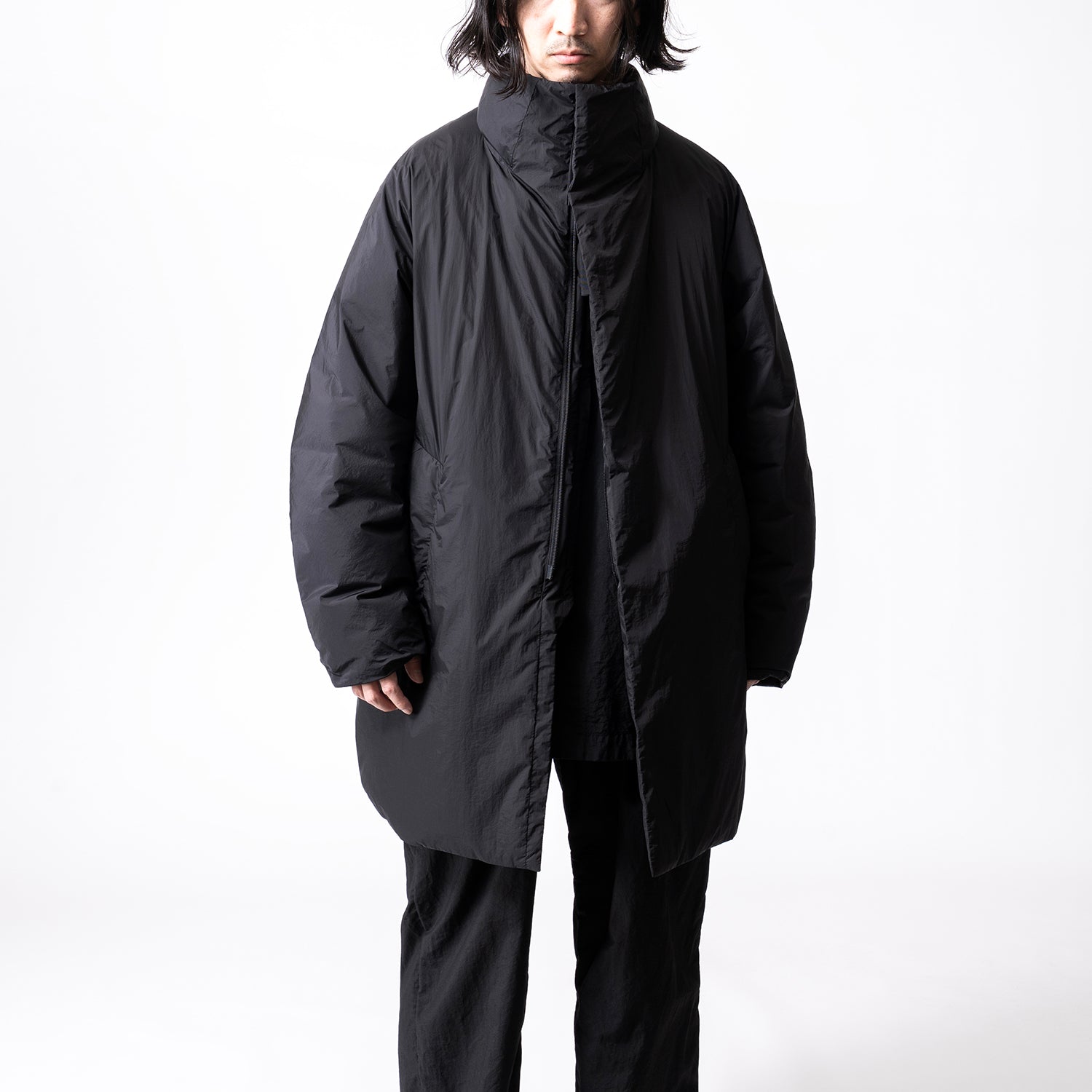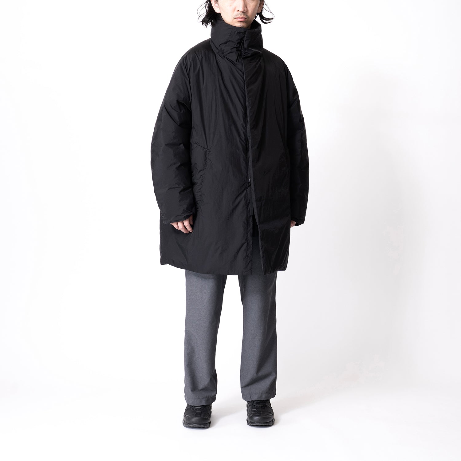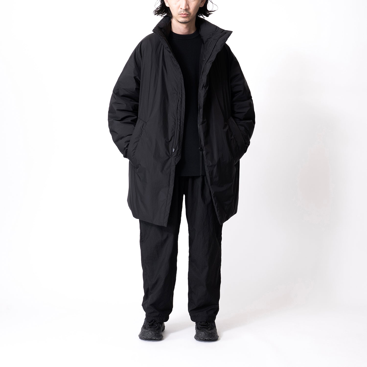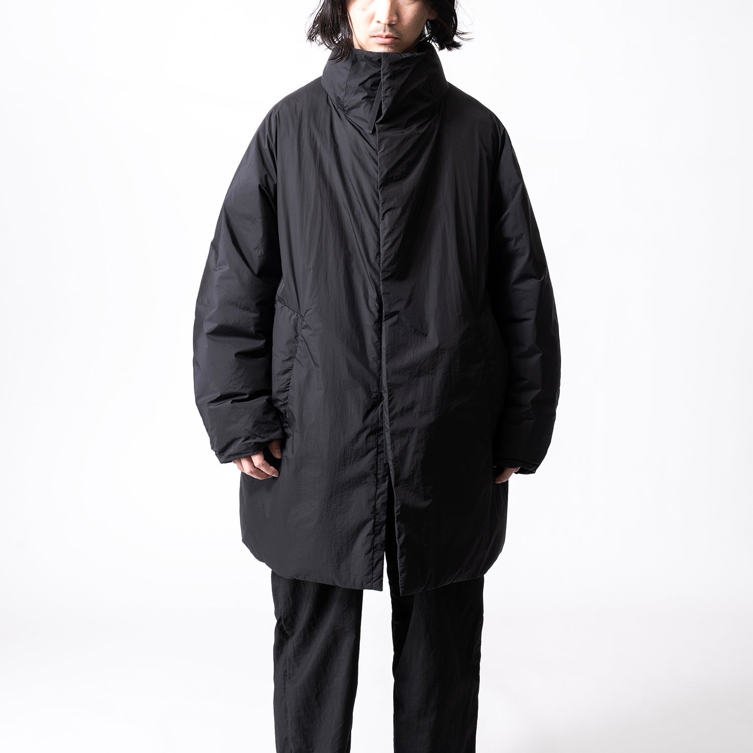 ゆったりとした身幅、綺麗な縦ラインを強調したシルエットが特徴のミドルコート。